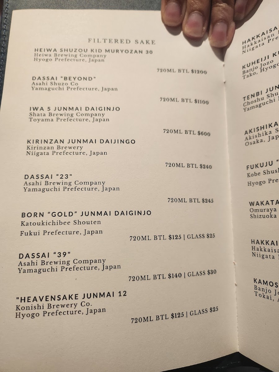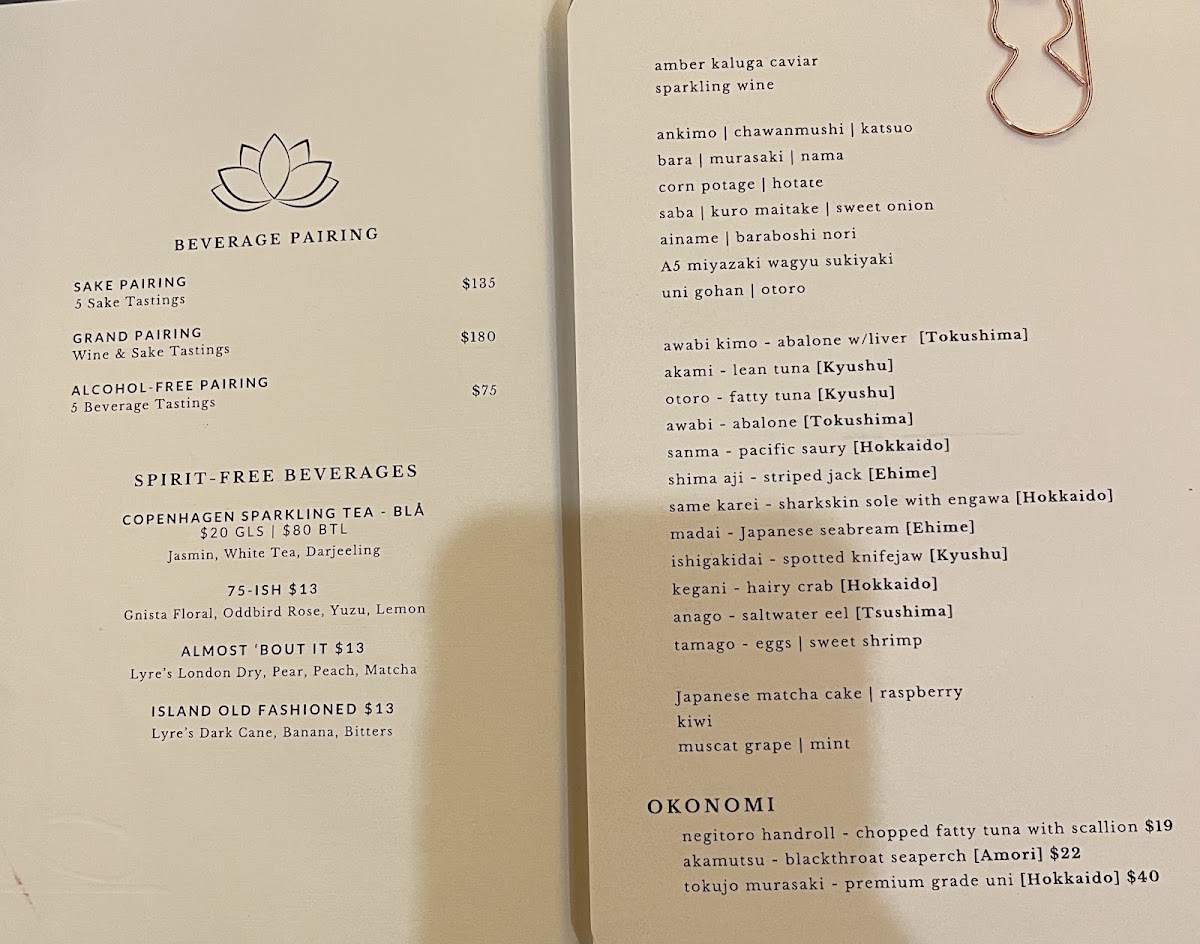 Additionally, Omakase Table offers an array of beverages, including Japanese sake like Gozenshu Junmai Bodaimoto Nigori and Amabuki Yamahai Junmai Omachi, as well as whisky options such as Suntory Toki and Akashi White Oak, allowing guests to complement their meal with exceptional drinks. For those who prefer beer, options like Sapporo Premium and Light, Kirin Ichiban, and Orion are available, along with unique spirits like Shiro Ginrei Shochu.